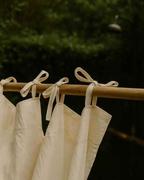 Confeccionada en Tela 100% Algodón virgen tejido TUSOR, liviana . Posee sistema de ajuste con cintas para atar y abertura para pasar el barrar (si así lo tuvieran) Las cintas te dejan añardirle el tamaño deseado, ya sea si deseas que arrastre o no, Si la usas en el baño puede enhebrarse el protector interior.