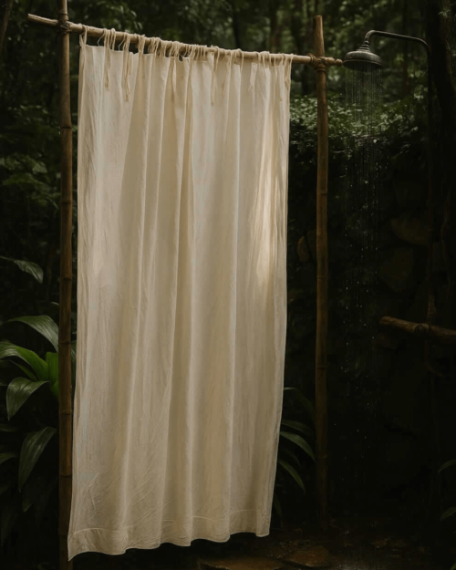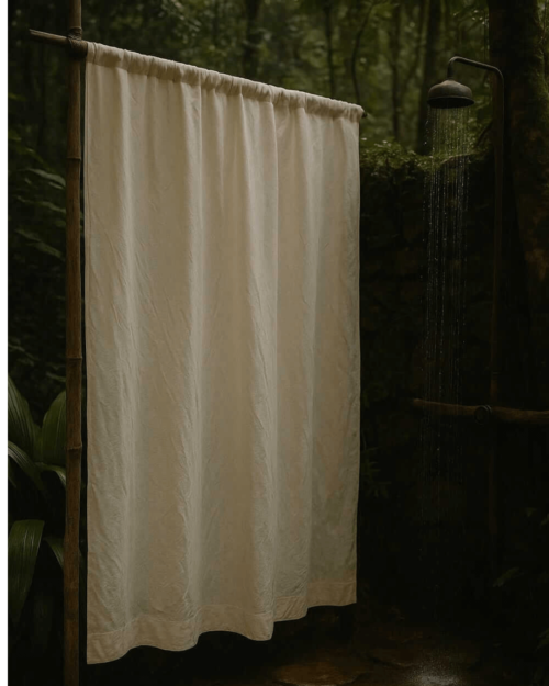 Medidas de la Cortina ZEN : 140 ANCHO x 1.85 cm ALTO (adicional 20 cm de cintas para atar extendiendo su arrastre) ideal para que quede estirada en la apertura de la bañera.